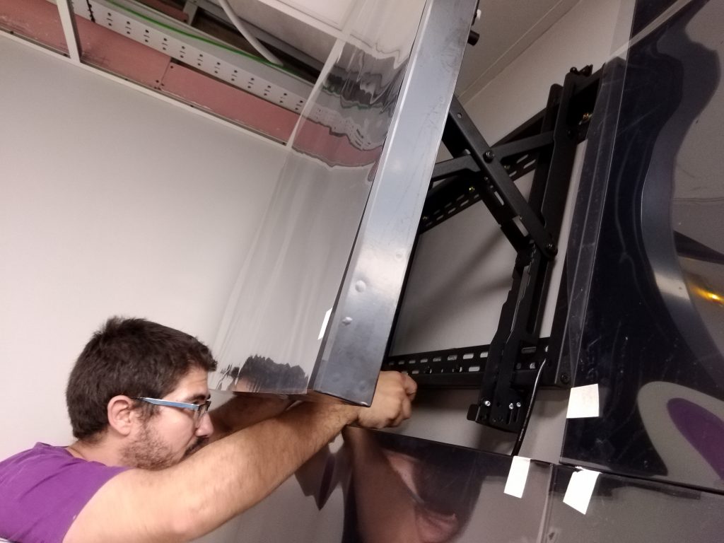 Técnico de Serviradio instalando las pantallas que forman el video wall.